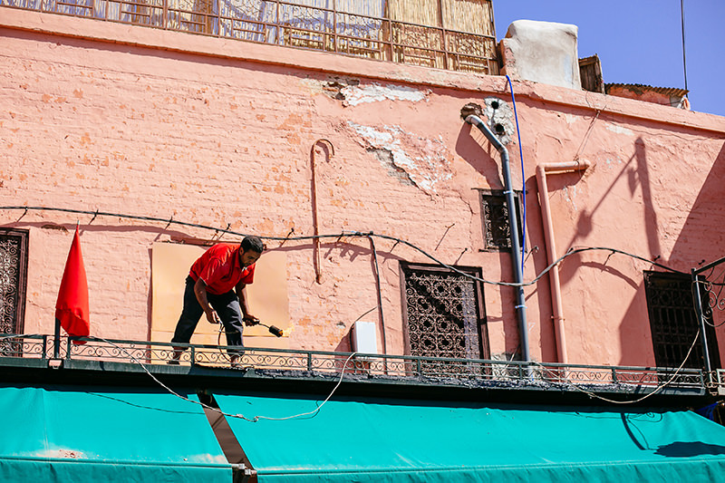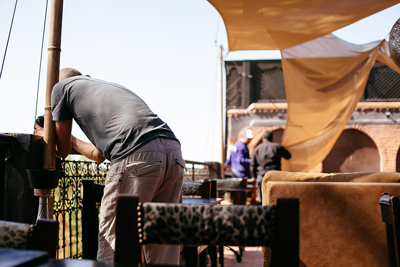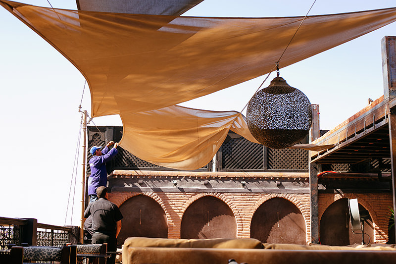At our first lunch in Marrakech, the overhead cover you see below, broke free from its wall and crashed down onto my head, so we moved to the other side of the bar and watched as they repaired it. Leon is unfazed, as you can see.
